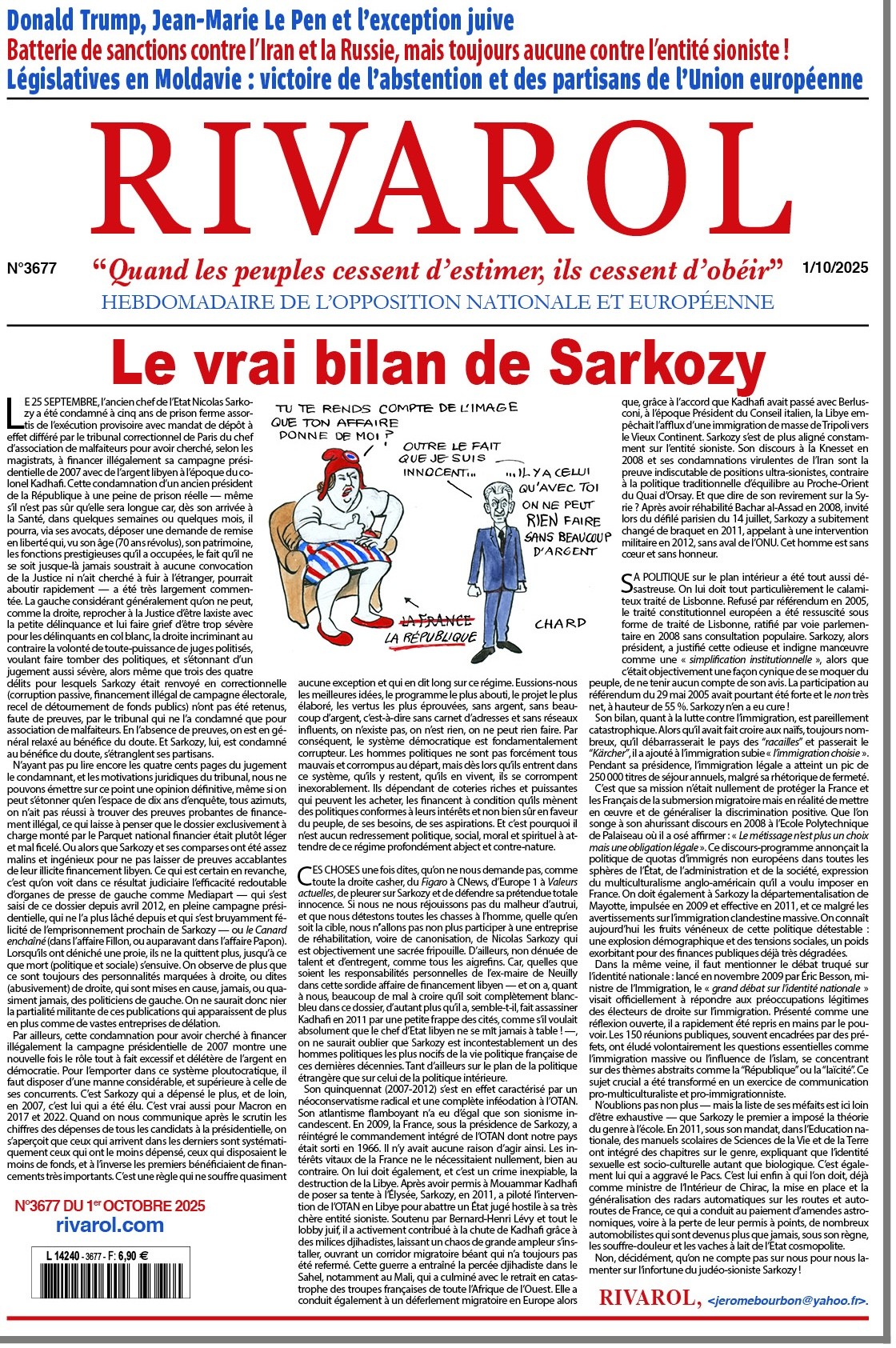 CES CHOSES une fois dites, qu’on ne nous demande pas, comme toute la droite casher, du Figaro à CNews, d’Europe 1 à Valeurs actuelles, de pleurer sur Sarkozy et de défendre sa prétendue totale innocence. Si nous ne nous réjouissons pas du malheur d’autrui, et que nous détestons toutes les chasses à l’homme, quelle qu’en soit la cible, nous n’’allons pas non plus participer à une entreprise de réhabilitation, voire de canonisation, de Nicolas Sarkozy qui est objectivement une sacrée fripouille. D’ailleurs, non dénuée de talent et d’entregent, comme tous les aigrefins. Car, quelles que soient les responsabilités personnelles de l’ex-maire de Neuilly dans cette sordide affaire de financement libyen — et on a, quant à nous, beaucoup de mal à croire qu’il soit complètement blanc-bleu dans ce dossier, d’autant plus qu’il a, semble-t-il, fait assassiner Kadhafi en 2011 par une petite frappe des cités, comme s’il voulait absolument que le chef d’Etat libyen ne se mît jamais à table ! —, on ne saurait oublier que Sarkozy est incontestablement un des hommes politiques les plus nocifs de la vie politique française de ces dernières décennies. Tant d’ailleurs sur le plan de la politique étrangère que sur celui de la politique intérieure.