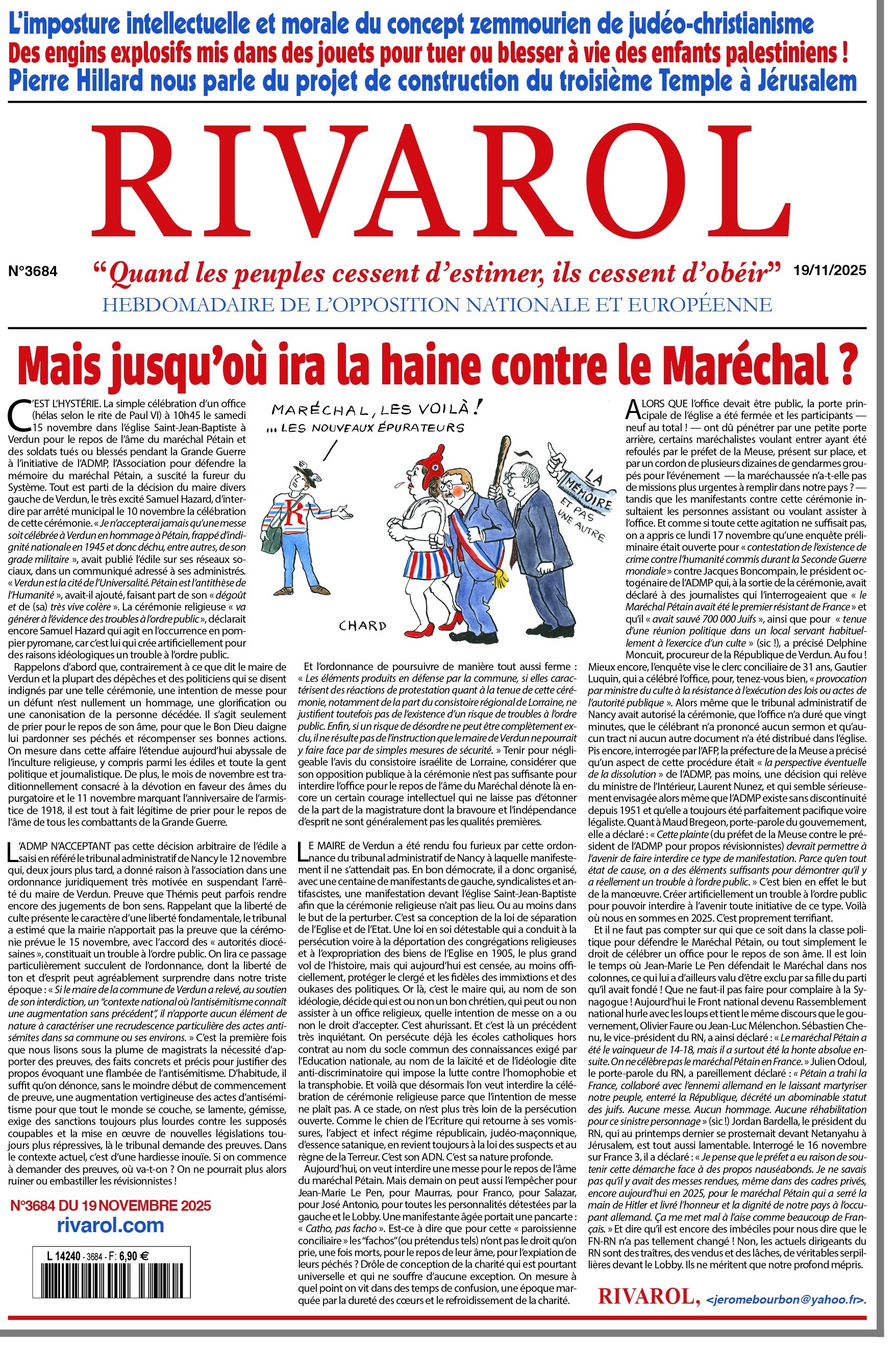 Et il ne faut pas compter sur qui que ce soit dans la classe politique pour défendre le Maréchal Pétain, ou tout simplement le droit de célébrer un office pour le repos de son âme. Il est loin le temps où Jean-Marie Le Pen défendait le Maréchal dans nos colonnes, ce qui lui a d’ailleurs valu d’être exclu par sa fille du parti qu’il avait fondé ! Que ne faut-il pas faire pour complaire à la Synagogue ! Aujourd’hui le Front national devenu Rassemblement national hurle avec les loups et tient le même discours que le gouvernement, Olivier Faure ou Jean-Luc Mélenchon. Sébastien Chenu, le vice-président du RN, a ainsi déclaré : « Le maréchal Pétain a été le vainqueur de 14-18, mais il a surtout été la honte absolue ensuite. On ne célèbre pas le maréchal Pétain en France. » Julien Odoul, le porte-parole du RN, a pareillement déclaré : « Pétain a trahi la France, collaboré avec l’ennemi allemand en le laissant martyriser notre peuple, enterré la République, décrété un abominable statut des juifs. Aucune messe. Aucun hommage. Aucune réhabilitation pour ce sinistre personnage » (sic !) Jordan Bardella, le président du RN, qui au printemps dernier se prosternait devant Netanyahu à Jérusalem, est tout aussi lamentable. Interrogé le 16 novembre sur France 3, il a déclaré : « Je pense que le préfet a eu raison de soutenir cette démarche face à des propos nauséabonds. Je ne savais pas qu’il y avait des messes rendues, même dans des cadres privés, encore aujourd’hui en 2025, pour le maréchal Pétain qui a serré la main de Hitler et livré l’honneur et la dignité de notre pays à l’occupant allemand. Ça me met mal à l’aise comme beaucoup de Français. » Et dire qu’il est encore des imbéciles pour nous dire que le FN-RN n’a pas tellement changé ! Non, les actuels dirigeants du RN sont des traîtres, des vendus et des lâches, de véritables serpillières devant le Lobby. Ils ne méritent que notre profond mépris.