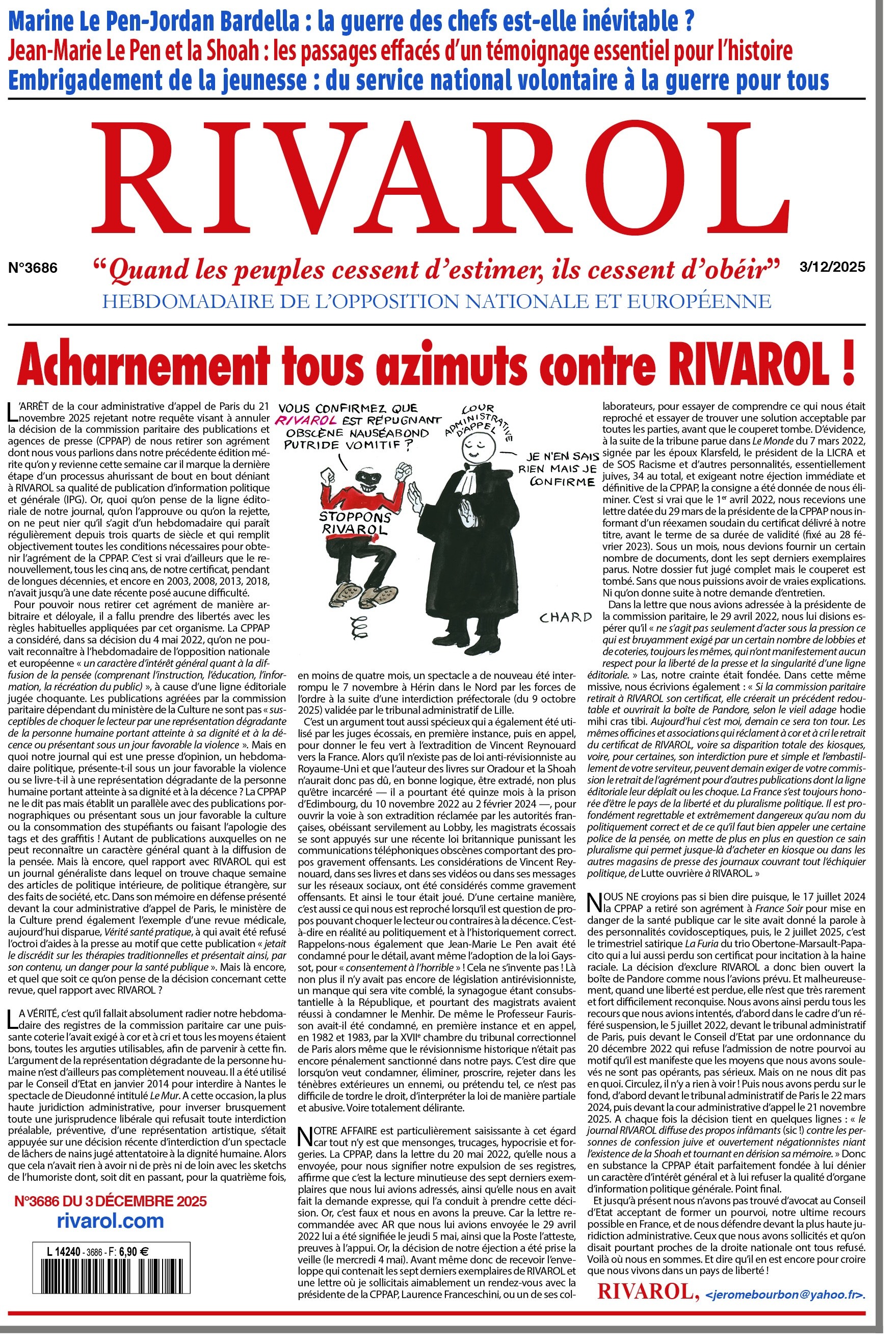 NOUS NE croyions pas si bien dire puisque, le 17 juillet 2024 la CPPAP a retiré son agrément à France Soir pour mise en danger de la santé publique car le site avait donné la parole à des personnalités covidosceptiques, puis, le 2 juillet 2025, c’est le trimestriel satirique La Furia du trio Obertone-Marsault-Papacito qui a lui aussi perdu son certificat pour incitation à la haine raciale. La décision d’exclure RIVAROL a donc bien ouvert la boîte de Pandore comme nous l’avions prévu. Et malheureusement, quand une liberté est perdue, elle n’est que très rarement et fort difficilement reconquise. Nous avons ainsi perdu tous les recours que nous avions intentés, d’abord dans le cadre d’un référé suspension, le 5 juillet 2022, devant le tribunal administratif de Paris, puis devant le Conseil d’Etat par une ordonnance du 20 décembre 2022 qui refuse l’admission de notre pourvoi au motif qu’il est manifeste que les moyens que nous avons soulevés ne sont pas opérants, pas sérieux. Mais on ne nous dit pas en quoi. Circulez, il n’y a rien à voir ! Puis nous avons perdu sur le fond, d’abord devant le tribunal administratif de Paris le 22 mars 2024, puis devant la cour administrative d’appel le 21 novembre 2025. A chaque fois la décision tient en quelques lignes : « le journal RIVAROL diffuse des propos infâmants (sic !) contre les personnes de confession juive et ouvertement négationnistes niant l’existence de la Shoah et tournant en dérision sa mémoire. » Donc en substance la CPPAP était parfaitement fondée à lui dénier un caractère d’intérêt général et à lui refuser la qualité d’organe d’information politique générale. Point final.