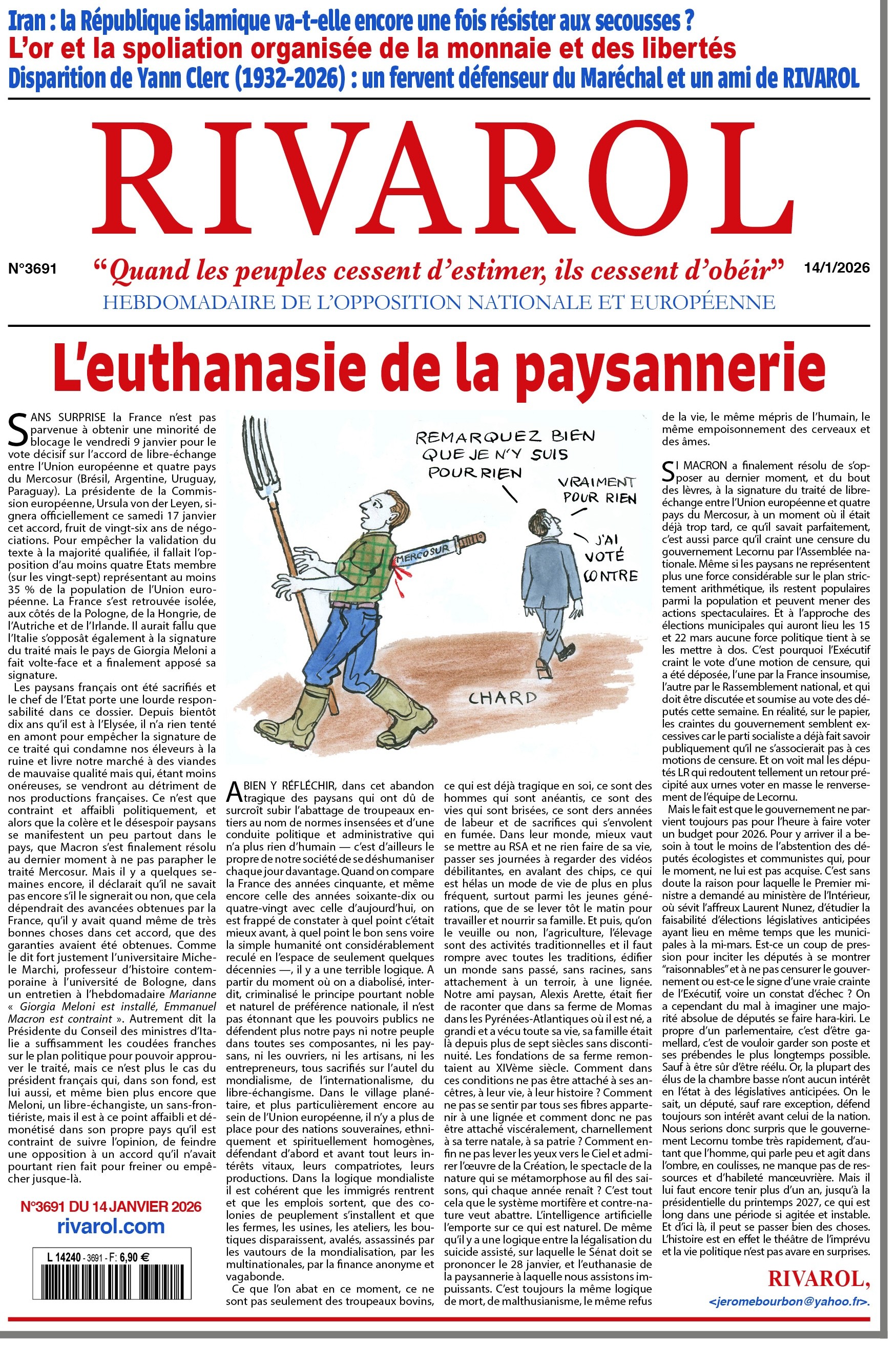 SI MACRON a finalement résolu de s’opposer au dernier moment, et du bout des lèvres, à la signature du traité de libre-échange entre l’Union européenne et quatre pays du Mercosur, à un moment où il était déjà trop tard, ce qu’il savait parfaitement, c’est aussi parce qu’il craint une censure du gouvernement Lecornu par l’Assemblée nationale. Même si les paysans ne représentent plus une force considérable sur le plan strictement arithmétique, ils restent populaires parmi la population et peuvent mener des actions spectaculaires. Et à l’approche des élections municipales qui auront lieu les 15 et 22 mars aucune force politique tient à se les mettre à dos. C’est pourquoi l’Exécutif craint le vote d’une motion de censure, qui a été déposée, l’une par la France insoumise, l’autre par le Rassemblement national, et qui doit être discutée et soumise au vote des députés cette semaine. En réalité, sur le papier, les craintes du gouvernement semblent excessives car le parti socialiste a déjà fait savoir publiquement qu’il ne s’associerait pas à ces motions de censure. Et on voit mal les députés LR qui redoutent tellement un retour précipité aux urnes voter en masse le renversement de l’équipe de Lecornu.