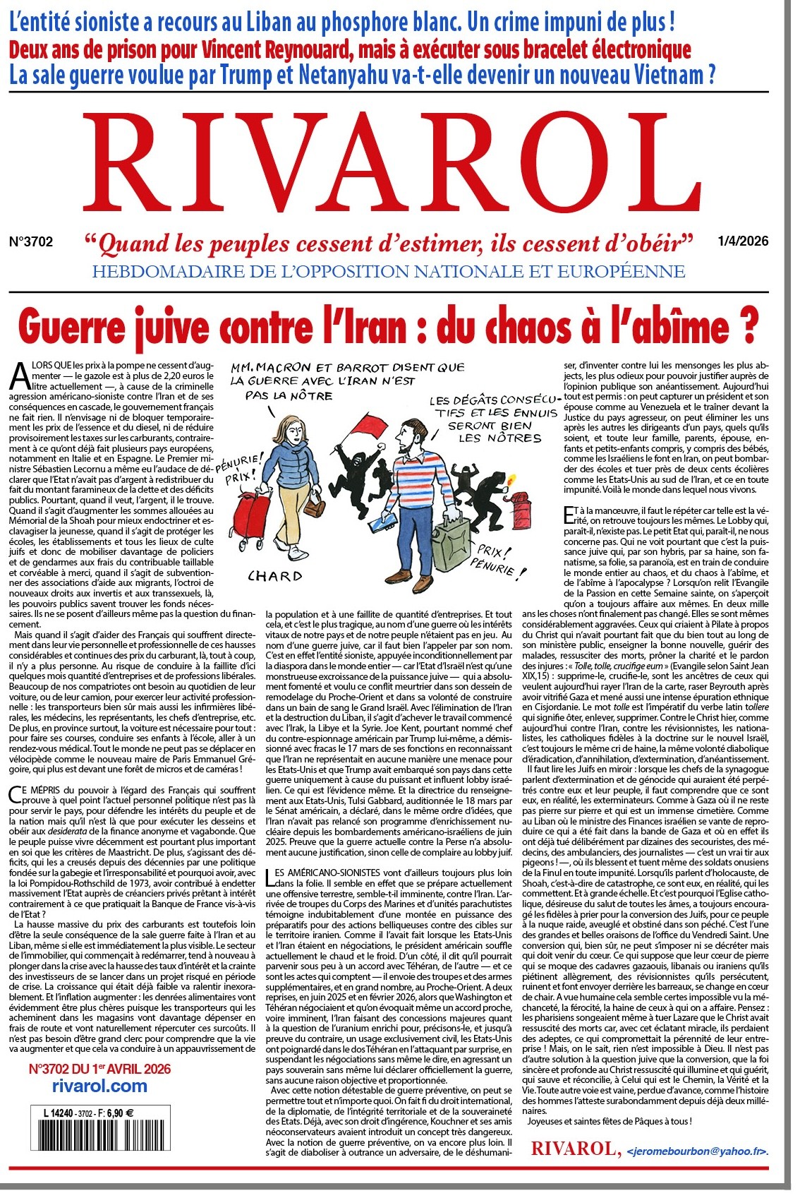ALORS QUE les prix à la pompe ne cessent d’augmenter — le gazole est à plus de 2,20 euros le litre actuellement —, à cause de la criminelle agression américano-sioniste contre l’Iran et de ses conséquences en cascade, le gouvernement français ne fait rien. Il n’envisage ni de bloquer temporairement les prix de l’essence et du diesel, ni de réduire provisoirement les taxes sur les carburants, contrairement à ce qu’ont déjà fait plusieurs pays européens, notamment en Italie et en Espagne. Le Premier ministre Sébastien Lecornu a même eu l’audace de déclarer que l’Etat n’avait pas d’argent à redistribuer du fait du montant faramineux de la dette et des déficits publics. Pourtant, quand il veut, l’argent, il le trouve. Quand il s’agit d’augmenter les sommes allouées au Mémorial de la Shoah pour mieux endoctriner et esclavagiser la jeunesse, quand il s’agit de protéger les écoles, les établissements et tous les lieux de culte juifs et donc de mobiliser davantage de policiers et de gendarmes aux frais du contribuable taillable et corvéable à merci, quand il s’agit de subventionner des associations d’aide aux migrants, l’octroi de nouveaux droits aux invertis et aux transsexuels, là, les pouvoirs publics savent trouver les fonds nécessaires. Ils ne se posent d’ailleurs même pas la question du financement.