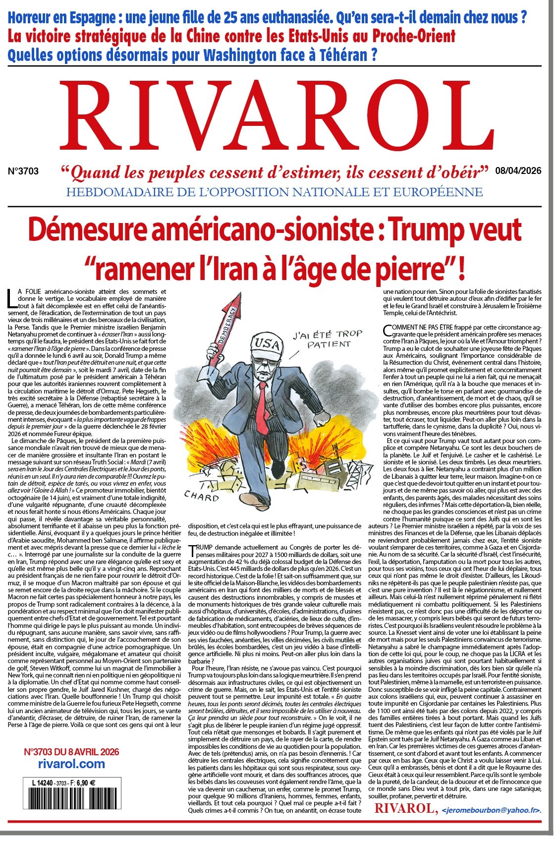 Le dimanche de Pâques, le président de la première puissance mondiale n’avait rien trouvé de mieux que de menacer de manière grossière et insultante l’Iran en postant le message suivant sur son réseau Truth Social : « Mardi (7 avril) sera en Iran le Jour des Centrales Electriques et le Jour des ponts, réunis en un seul. Il n’y aura rien de comparable !!! Ouvrez le putain de détroit, espèce de tarés, ou vous vivrez en enfer, vous allez voir ! Gloire à Allah ! » Ce promoteur immobilier, bientôt octogénaire (le 14 juin), est vraiment d’une totale indignité, d’une vulgarité répugnante, d’une cruauté décomplexée et nous ferait honte si nous étions Américains. Chaque jour qui passe, il révèle davantage sa véritable personnalité, absolument terrifiante et il abaisse un peu plus la fonction présidentielle. Ainsi, évoquant il y a quelques jours le prince héritier d’Arabie saoudite, Mohammed ben Salmane, il affirme publiquement et avec mépris devant la presse que ce dernier lui « lèche le c… ». Interrogé par une journaliste sur la conduite de la guerre en Iran, Trump répond avec une rare élégance qu’elle est sexy et qu’elle est même plus belle qu’il y a vingt-cinq ans. Reprochant au président français de ne rien faire pour rouvrir le détroit d’Ormuz, il se moque d’un Macron maltraité par son épouse et qui se remet encore de la droite reçue dans la mâchoire. Si le couple Macron ne fait certes pas spécialement honneur à notre pays, les propos de Trump sont radicalement contraires à la décence, à la pondération et au respect minimal que l’on doit manifester publiquement entre chefs d’Etat et de gouvernement. Tel est pourtant l’homme qui dirige le pays le plus puissant au monde. Un individu répugnant, sans aucune manière, sans savoir vivre, sans raffinement, sans distinction qui, le jour de l’accouchement de son épouse, était en compagnie d’une actrice pornographique. Un président inculte, vulgaire, mégalomane et amateur qui choisit comme représentant personnel au Moyen-Orient son partenaire de golf, Steven Witkoff, comme lui un magnat de l’immobilier à New York, qui ne connaît rien ni en politique ni en géopolitique ni à la diplomatie. Un chef d’Etat qui nomme comme haut conseiller son propre gendre, le Juif Jared Kushner, chargé des négociations avec l’Iran. Quelle bouffonnerie ! Un Trump qui choisit comme ministre de la Guerre le fou furieux Pete Hegseth, comme lui un ancien animateur de télévision qui, tous les jours, se vante d’anéantir, d’écraser, de détruire, de ruiner l’Iran, de ramener la Perse à l’âge de pierre. Voilà ce que sont ces gens qui ont à leur disposition, et c’est cela qui est le plus effrayant, une puissance de feu, de destruction inégalée et illimitée !